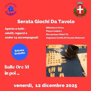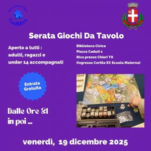 Ogni venerdì sera la Biblioteca Civica di Riva presso Chieri si trasforma in un spazio dedicato al gioco e alla socialità! Dalle 21 in poi ti aspettiamo per provare insieme giochi da tavolo, di ruolo e di società, scegliere tra decine di titoli diversi e conoscere nuovi amici. La serata è gratuita, aperta a tutti […]